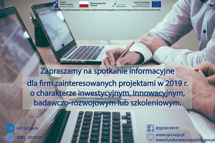 Główny Punkt Informacyjny Funduszy Europejskich w Szczecinie serdecznie zaprasza na bezpłatne spotkanie informacyjne dla firm zainteresowanych projektami o charakterze inwestycyjnym, innowacyjnym, badawczo-rozwojowym lub szkoleniowym w 2019 r., które odbędzie się 24 stycznia 2019 r., w godz. 10:00-13:00 w Głównym Punkcie Informacyjnym Funduszy Europejskich w Szczecinie, ul. Kuśnierska 12b (wejście od ulicy Grodzkiej).