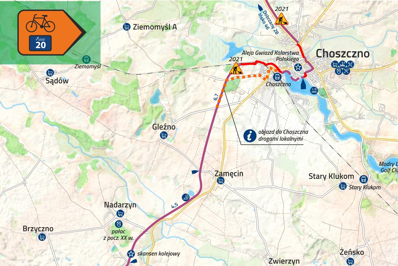 Oprócz tzw. odcinków inwestycyjnych, czyli budowanych od podstaw zaplanowane są drobniejsze prace na Trasie Pojezierzy Zachodnich. Ponad 7 kilometrów do Pakości w kierunku rzeki Ina zyska efektowne oznakowanie. Nowe znaki ułatwią również przejazd przez Choszczno.