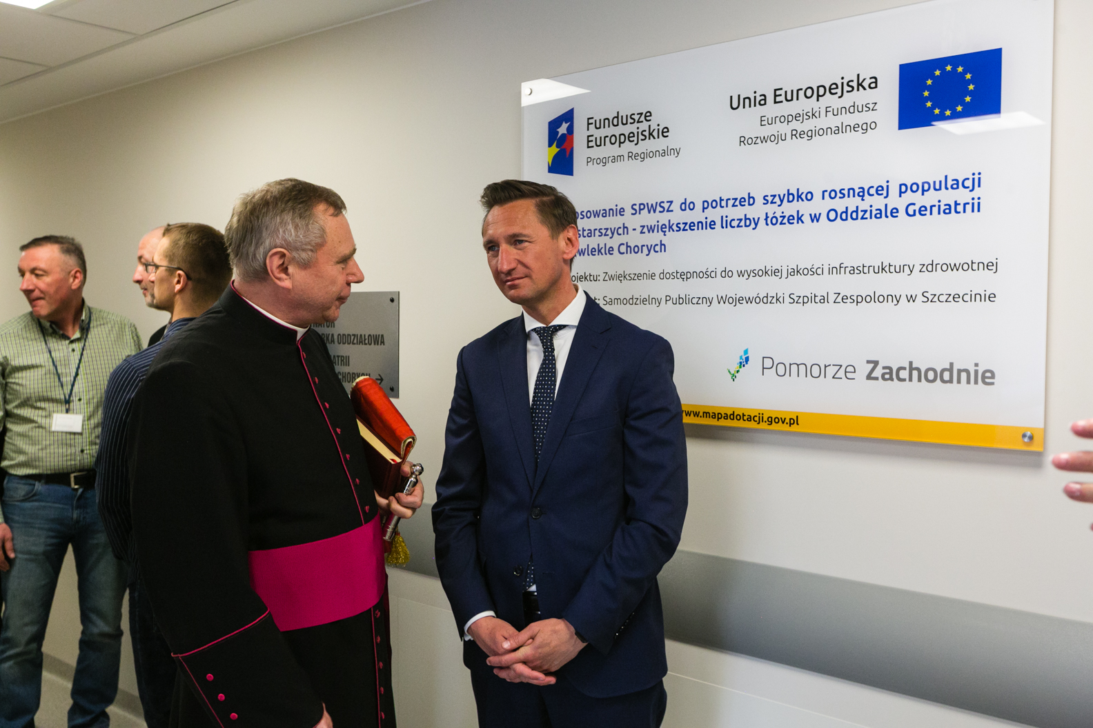Zakończył się remont Oddziału Geriatrii i Przewlekle Chorych w Szpitalu Wojewódzkim w Szczecinie przy ul. Arkońskiej. Seniorzy będą teraz hospitalizowani w komfortowych, dwuosobowych salach. Wszystkie pokoje posiadają niezależne węzły sanitarne i są dostosowane do potrzeb osób z niepełnosprawnościami. Pacjenci będą mogli korzystać także z nowoczesnej rehabilitacji. Uroczyste otwarcie odnowionej przestrzeni, z udziałem marszałka województwa Olgierda Geblewicza, odbyło się w czwartek, 4 kwietnia 2019 roku.